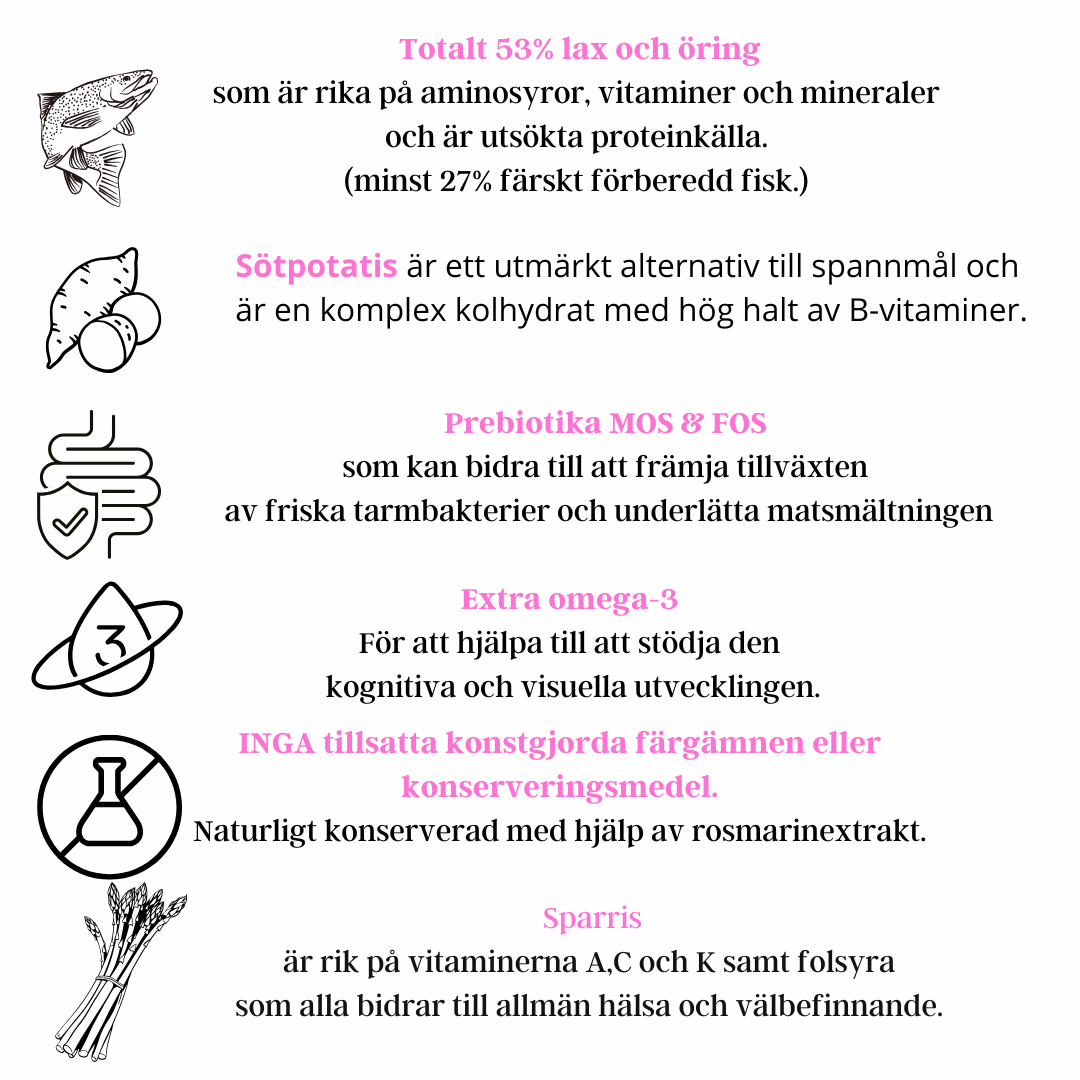 För liten vuxen hund - Lax med öring, sparris och sötpotatis Källhagens gård