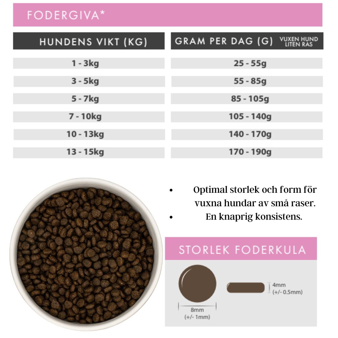 Denna är anpassad för vuxna hundar av liten ras och levereras i 2kg förpackningar.