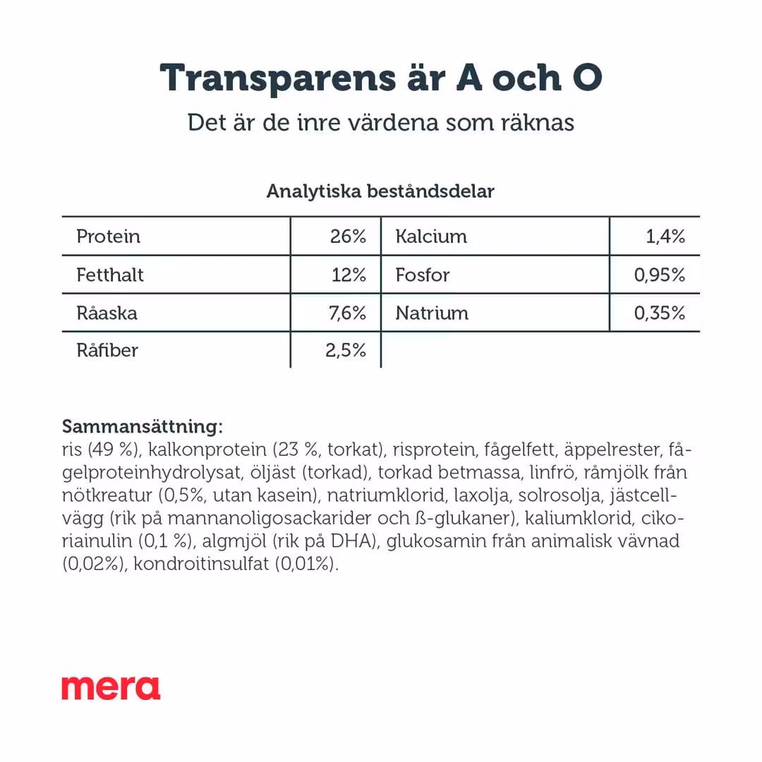 Med MERA skyddskoncept tillhandahåller mera pure sensitive Junior Kalkon & ris ett balanserat recept med aktiva ingredienser för att möta din valp och unghunds dagliga behov. Det är ett komplett helfoder för växande hundar av alla raser i en sensitive-formula med ett begränsat antal ingredienser. Den kan såklart även ges till valpar och unghundar som inte är i behov av en skonsam kost för den som enkelt vill begränsa hundens ingredienslista.