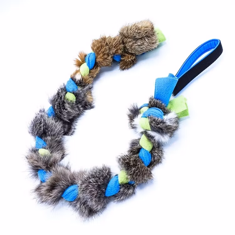 Underbar fleeceleksak med kaninpäls. Den blir snabbt en favorit och hundarna fullkomligen älskar den. Handtaget är klätt i softshell och blir på det viset mycket mjukt att hålla i för hundägaren. Remmen sys med i princip hela leksaken och gör det på det viset väldigt stark.