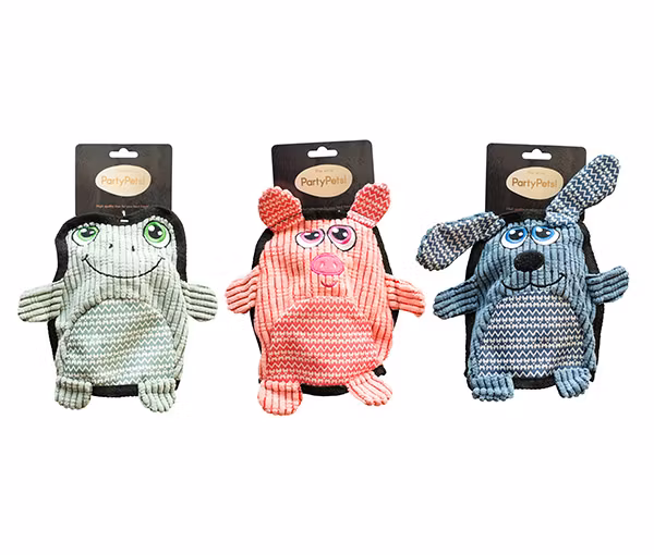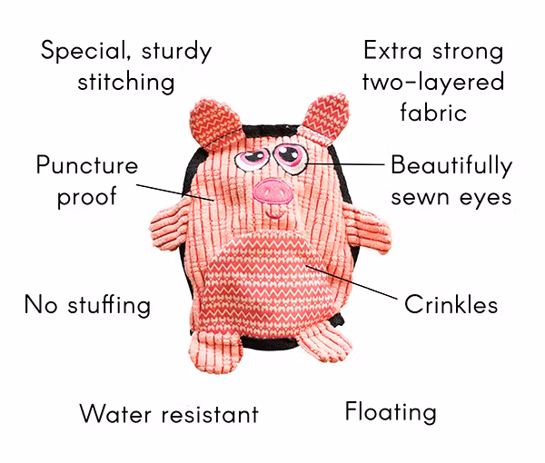 - Varje leksak är utrustad med en stor punkteringssäker squeaker som ramkallar pipljud.