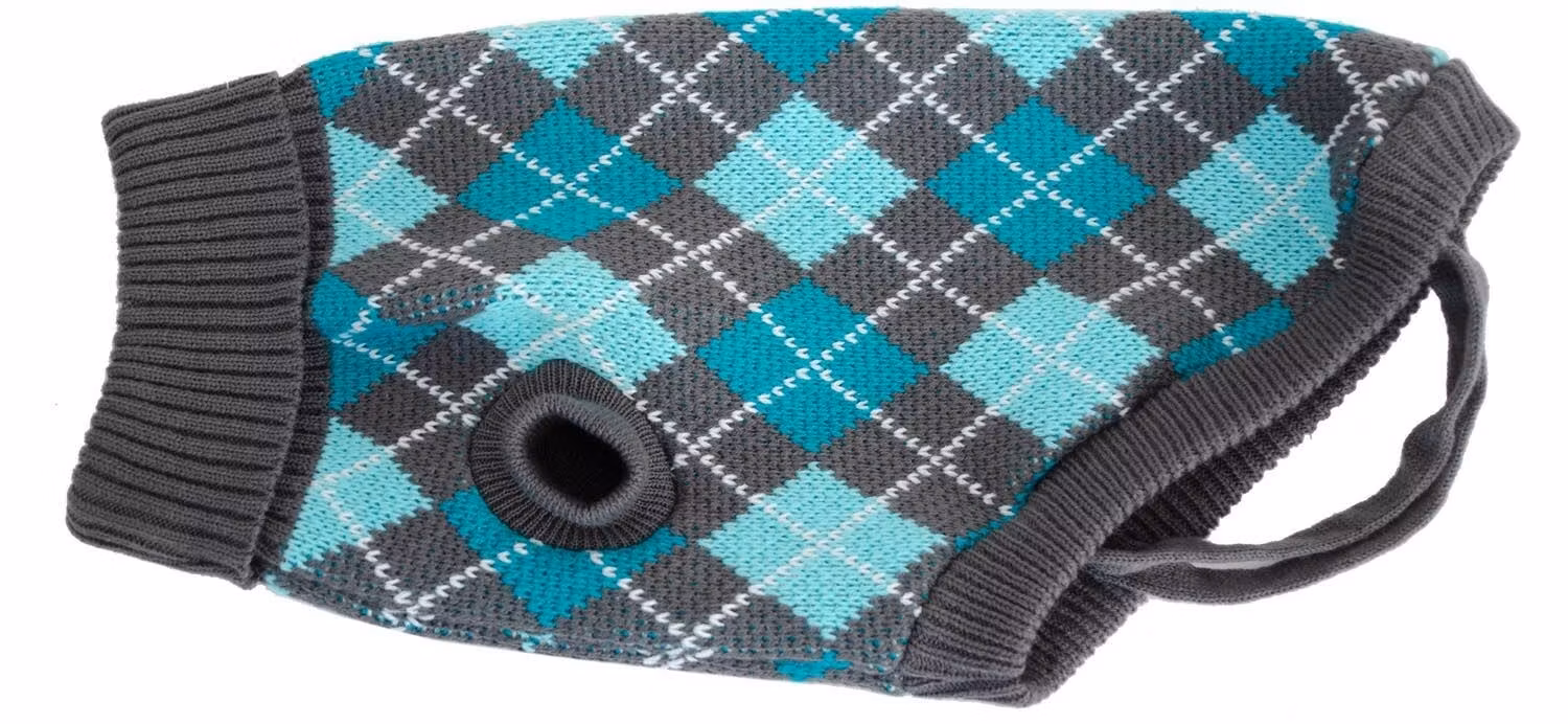 För att hålla tröjan säkert på plats har den korta muddar runt frambenen och band vid bakbenen. Tröjan är av 100% akryl.